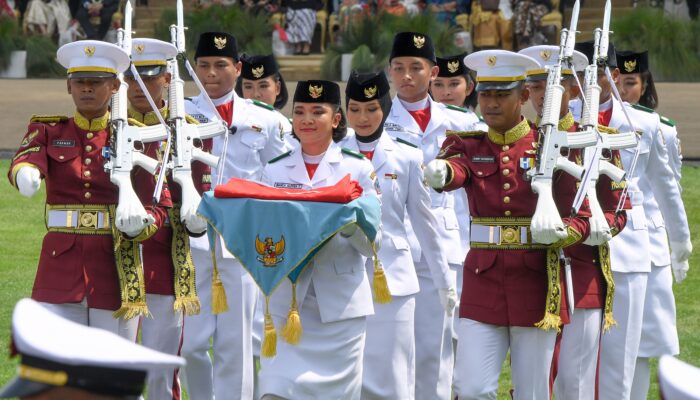 Pasukan Pengibar Bendera Pusaka (Paskibraka) membawa duplikat Bendera Pusaka Merah Putih untuk dikibarkan dalam Upacara Peringatan Detik-Detik Proklamasi Kemerdekaan ke-80 Republik Indonesia di Istana Merdeka, Jakarta, Minggu (17/8/2025). (Foto: Antara/Galih Pradipta)