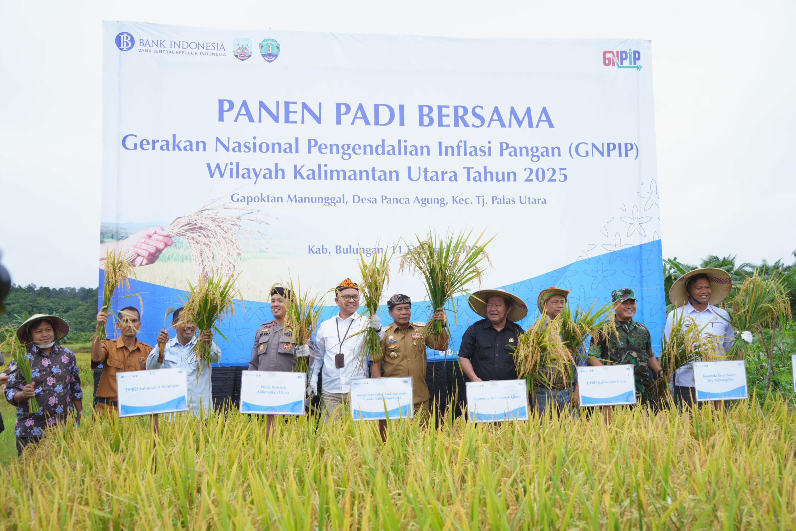 BULUNGAN – Gubernur Kalimantan Utara (Kaltara) Dr. H. Zainal A. Paliwang, S.H., M.Hum., mengikuti kegiatan Panen Padi Bersama dalam rangka Gerakan Nasional Pengendalian Inflasi Pangan (GNPIP) di Lahan Persawahan Gapokan Manunggal, Desa Panca Agung, Kecamatan Tanjung Palas Utara, Kabupaten Bulungan, Selasa (11/2).